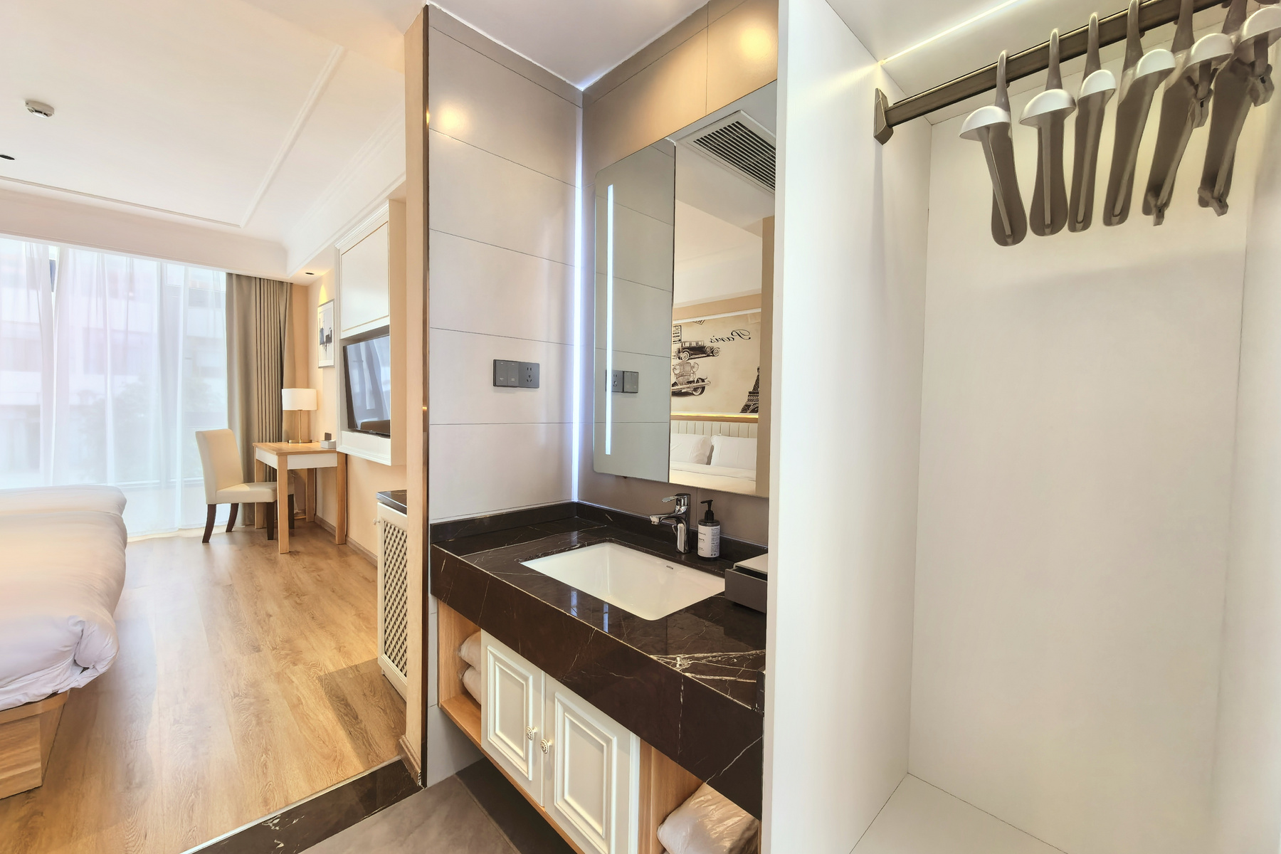 酒店整体造型为简约法式建筑风格,典雅赏析悦目,酒店设有大堂休息区,拥有自助洗衣房,自助早餐及停车场,客房内设施设备完善,所有房间均提供无线上网、有线电视、电话、宽带、USB接口、电吹风等设施。为客人提供一个方便、卫生、的入住环境。酒店位于中国翡翠交易之都一一瑞丽市,地理位置优,处于瑞丽市中心,紧邻瑞丽繁华夜市彩云城仅350米,步行6分钟即可到达,距离财富广场537米,步行8分钟可到达,美食逛街购物娱乐都很便利,距离弄莫湖1.4公里,毗邻瑞丽市第二中学、瑞丽市珠宝街、瑞丽市旅游步行街、瑞丽市民族中学、腾隆国际商业广场、瑞丽市大型边贸市场、星河蓝湾时代广场、瑞丽市人民医院,交通发达、出行便利。是您商务出行、旅游休闲度假的佳之选。
